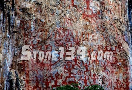 廣西壯族自治區申遺辦專家辦公室副主任藍日勇說,左江花山巖畫文化景觀是自然與人的共同作品。巖畫點大都位于江河的拐彎處,面向來水的高大峭壁上,畫面大多距水面15~100米,最高130米,對面往往有開闊的臺地。畫面多為眾多側身人像圍繞著一個形象高大、裝束特殊的正身蹲式人形,是當時駱越人舉行原始宗教祭祀集體歌舞的場面。而畫面上的銅鼓,至今仍是當地人節慶日使用的打擊樂器。